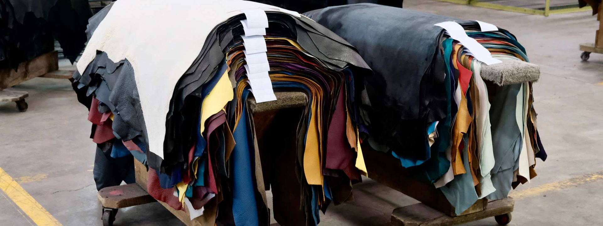 Suede colour samples hang at the factory