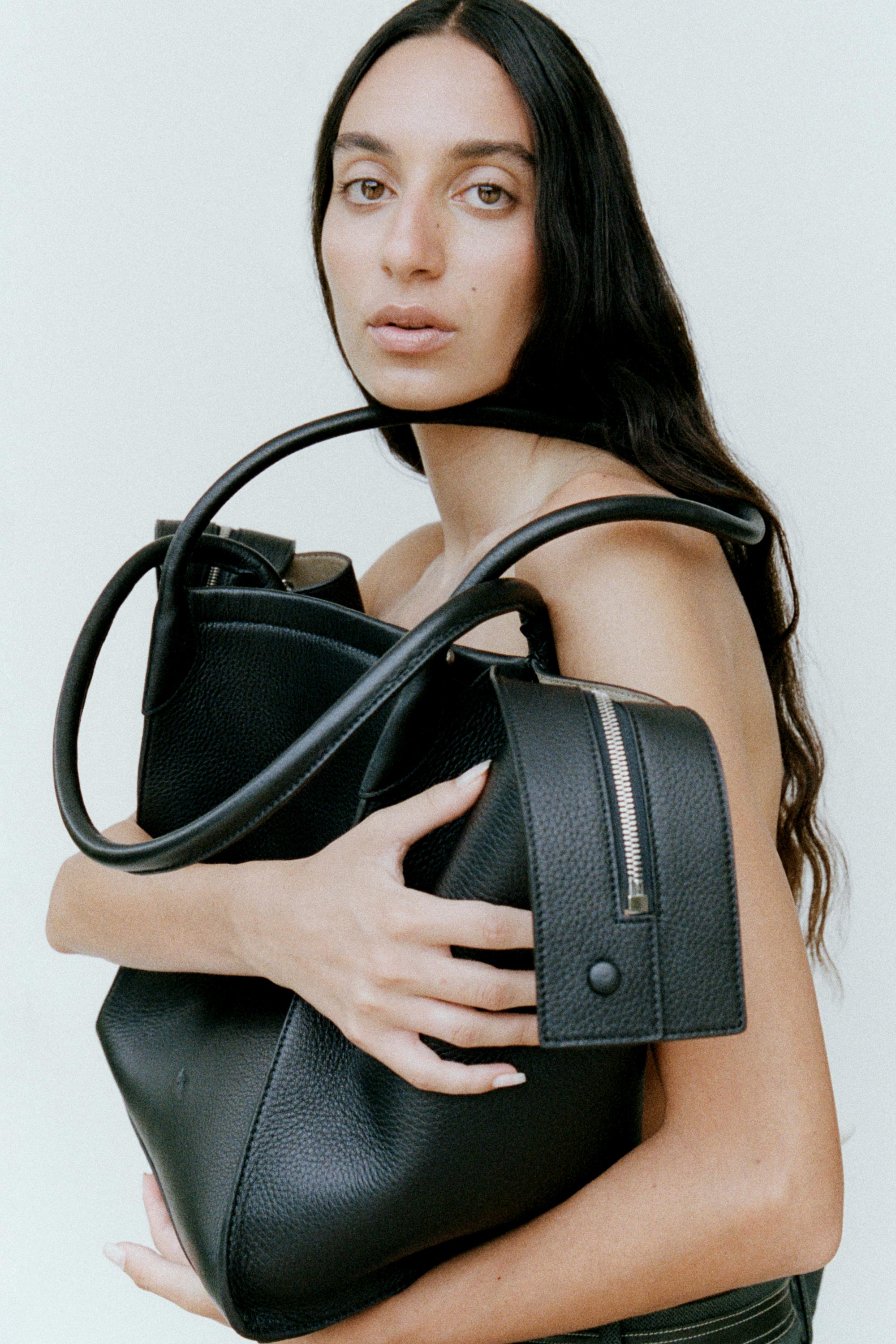 Claudia Tote in Black Deer Nappa worn on shoulders