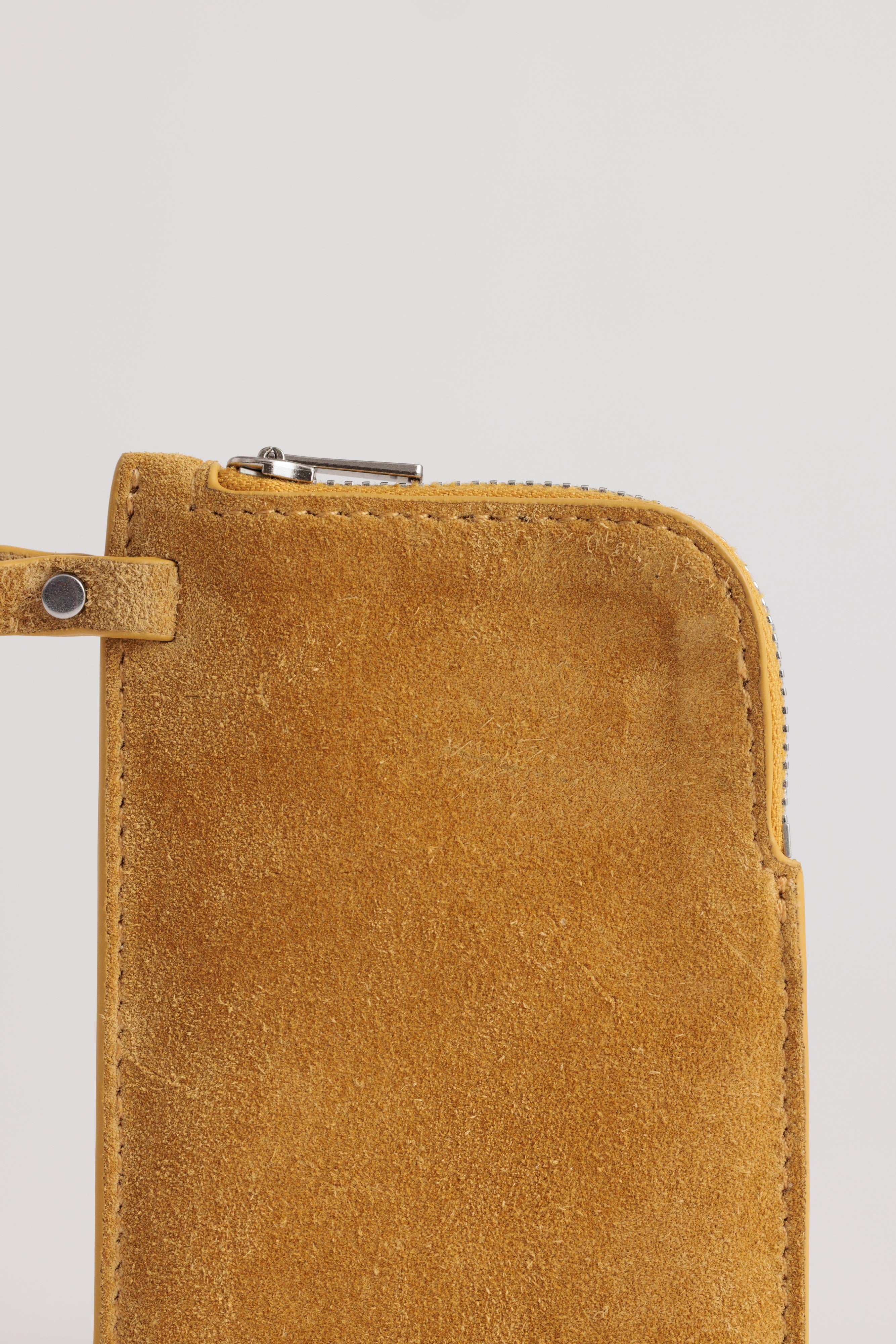 Suede is a delicate, porous leather that needs extra attention. Treat with Yu Mei’s suede-specific protector spray before first use, and regularly thereafter, to help prevent watermarks and stains. If it gets wet, let it dry naturally—away from heat and sunlight—then gently brush the nap with a suede brush or soft toothbrush.